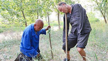 生活在太行山东麓一个小村庄的贾海霞,为了改变贫困生活,从2002年起同本村失去双臂的贾文其一起在当地自行种树。没钱买树苗,他就借助贾文其的肩膀爬上树,再按对方指挥用镰刀砍枝育苗。