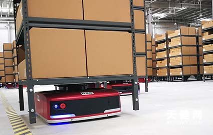这些“小蓝人”们有的负责带着订单箱,自己赶到货架指定区拣货;有的负责带着移动货架,自己去找订单箱装货。近3万平方米的库区内,它们形成一个繁忙的智能运输和工作系统,互相避让、自行充电。