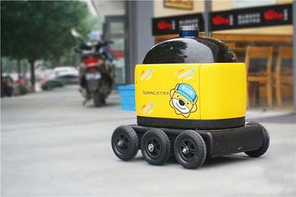 “卧龙一号”是由苏宁自主研发的无人快递车,在无人控制的情况下,该快递车可以实现避让行人和车辆、乘坐电梯、叫门等动作,智能完成快递送达工作。据苏宁物流集团研究院副院长栾学峰介绍,“卧龙一号”上安装有融合了激光雷达、GPS、惯导等多传感器为一体的定位系统,通过激光雷达扫描小区全景三维地图,大到建筑、小到树木花草都清晰可见,晴雨天气、白天夜晚等外在环境不会对它的工作造成影响。同时,结合GPS导航,“卧龙一号”可以利用其搭载的人工智能芯片,计算并分析出目的地所在位置,规划路线,把快递准确无误地送到消费者手中,目前“卧龙一号”已经进行试点。团队还在研发其“四足行走”版本,将来可以实现爬楼,为一些没有电梯的小区提供智能服务。