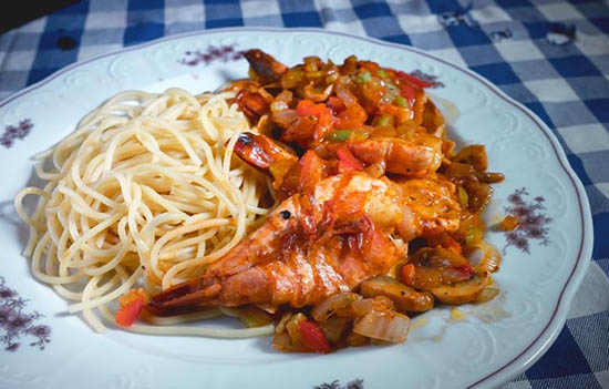 火焰大虾意粉,意粉不会煮太腍是这店的传统。