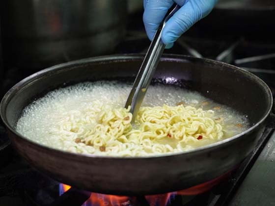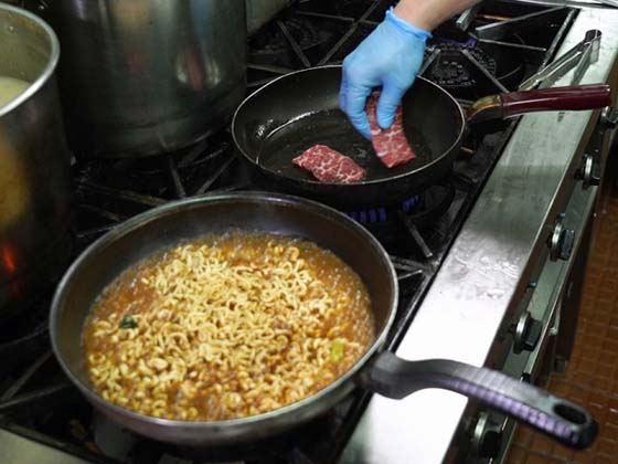 “炸酱乌龙面”由两种即食面:炸酱面及浣熊面混煮而成,两者均是韩国品牌农心旗下出品,所以电影播出后,农心特别公开料理秘方,翻译成多国语言让影迷参考。今次记者就找来香港新麻浦BBQ主厨Lee Sae Hee教大家制作,采用辛辣面及炸酱面煮出改良版本,材料更易买到,口味亦带点微辣,相当惹味。