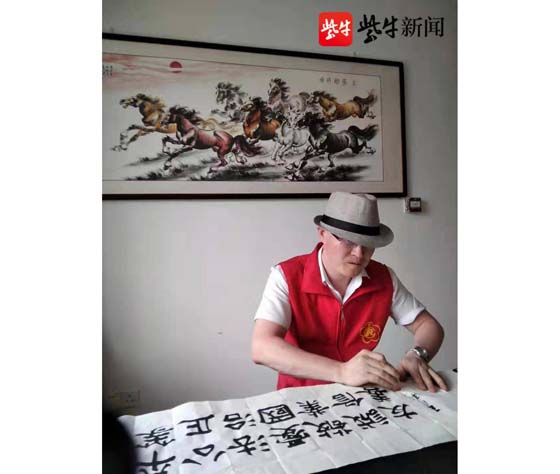 一望无际的草原上,许多马儿在奔跑。这是淮安43岁视障人士王行卫的国画作品,他拿着放大镜,眼睛紧紧贴近宣纸,进行绘画的创作。他告诉扬子晚报紫牛新闻记者,自己是白化病患者,2006年,因视神经萎缩,逐渐看不清任何东西,视力降至0.01至0.02。“看东西像隔着一层塑料薄膜,朦胧模糊,视力衰退后,我一直生活在这样的世界里。”