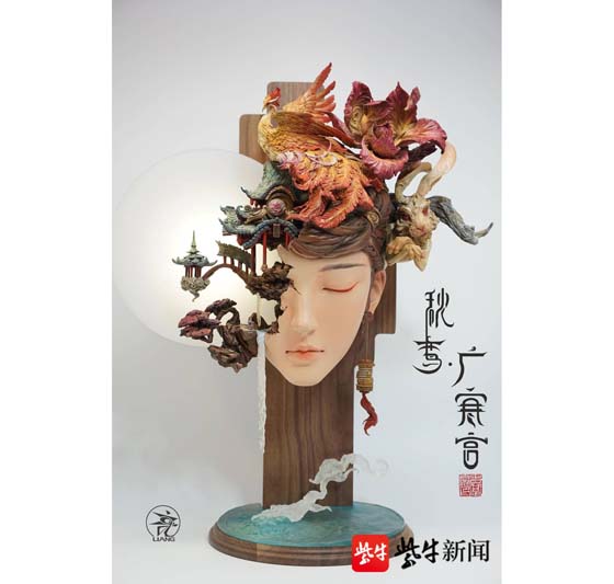 “其形也,翩若惊鸿,婉若游龙。荣曜秋菊,华茂春松。髣髴兮若轻云之蔽月,飘飖兮若流风之回雪。”有人引用曹植的《洛神赋》评价袁星亮的作品《秋鸾·广寒宫》。这个他最“出圈”也最知名的作品,取自中国古代神话故事“嫦娥奔月”。嫦娥、鸾凤、繁花、玉兔、桂枝、宫殿……一个精美繁复、幽静深远的立体作品呈现在眼前:嫦娥宁静从容,广寒宫、圆月巧妙地与残缺的人脸组合成一个完整的作品。精美的造型之外还有巧思,圆月其实是一个反光板,把灯光映成皎洁清冷的月光。对于这个美丽但残缺的嫦娥脸庞,袁星亮有着自己独特的创意,“有时候残缺的不一定是不好的,宫殿和圆月其实补全了另外半张脸,整体上它依旧是完整的。”
