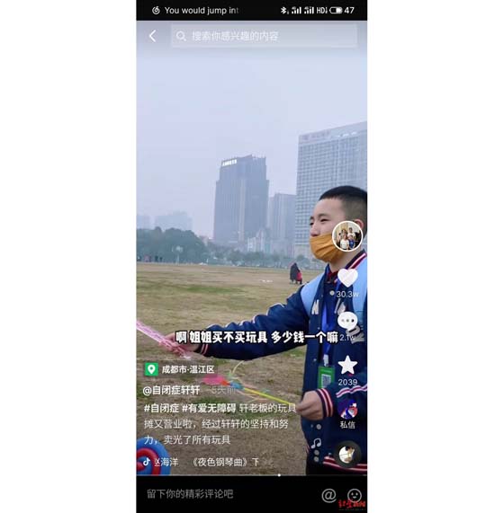 日前,成都温江区的一位父亲带着儿子在广场上卖玩具的视频在抖音平台火了,吸引了几十万网友的观看。视频里,父亲干强不断引导和鼓励儿子轩轩与陌生人沟通交流。