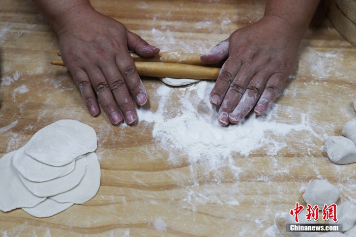 朱红霞的“双杖擀皮”手法至今仍是一绝。擀面杖约八寸长,中间粗两端细,运用双手之力使面剂在两个擀面杖下旋转,转眼即成面皮,状如圆月,薄厚一致,大小均匀。