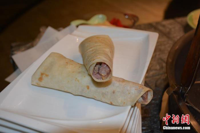 名叫朝天锅,食用时却无“锅”,属鲁菜系的朝天锅特色是以烙饼卷肉。