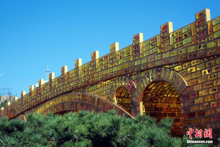 舒勇:这件大型雕塑作品长28米、宽4.8米、高7.2米,以中国著名的赵州桥为创作原型,由2万块“琥珀金砖”砌成。这么多“琥珀金砖”和谐、整齐地叠加在一起,象征着共建“一带一路”国家共同努力,携手架设一座通往美好未来的“希望金桥”。