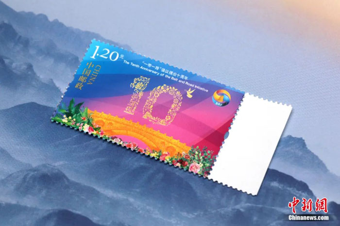 该邮票也出现在了第三届“一带一路”国际合作高峰论坛民心相通专题论坛。在论坛“丝路金桥成就美好生活”环节,拥有1000多万中国社交媒体“粉丝”的非洲姑娘罗斯(Rose),讲述了通过“丝路金桥”收获美好生活的动人故事,以及她把中国文化带到非洲、把非洲文化带到中国的民心相通故事。我登台把绘有“丝路金桥”的《“一带一路”倡议提出十周年》纪念邮票送给了她。