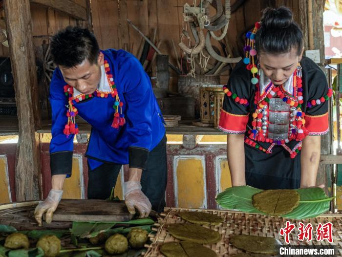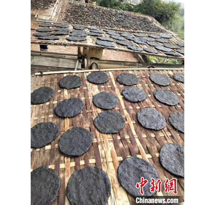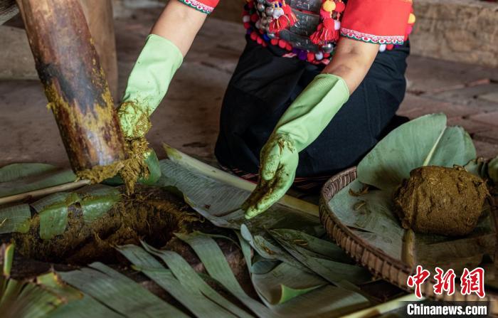 李岩所告诉记者,制作酸茶首先要将新鲜茶叶蒸熟,取出茶叶待冷却后装到竹筒里一层层压实,用新鲜芭蕉叶封口。选一处阴凉的地方挖一个深坑,垫上芭蕉叶,再将封好的竹筒埋起来,让茶叶在地下慢慢发酵。经过一个半月的等待,挖出竹筒把茶叶取出。“上好的酸茶会呈金黄色,将发酵后的茶叶放在石臼中,用传统的脚碓舂烂揉成小团,压成饼状,晒两天左右,剪成小块,接着再暴晒五天,就能得到成品。”