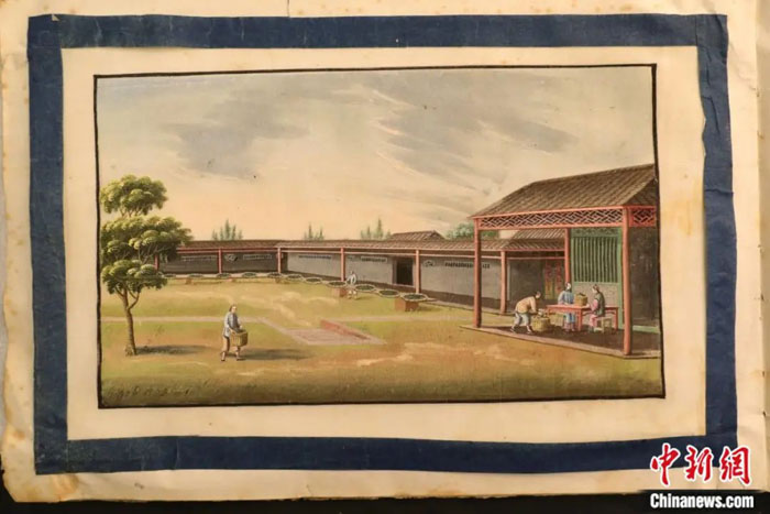 我馆收藏有两组茶叶生产的通草画,详细描绘了茶叶种植、浇水、采摘、筛选、烘制、包装、搬运、销售等一系列程序。画面上还可以看到来采购的外商,以及贴着“古劳”“武夷”等商品标签的货箱。古劳茶是产于广东地区的名茶,宋元时期开始栽培,清乾隆和道光年间生产达到全盛,武夷茶则是福建地区名茶的代表。据史料记载,至清道光年间,广州出口茶叶总量约占全中国的九成以上。