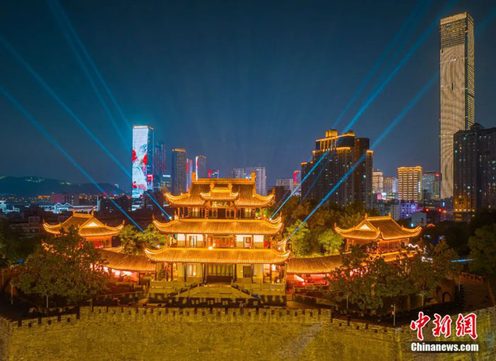 一座天心阁,半部长沙史。这座拥有百年历史的市民公园,如今被“爆改”成数字主题光影公园。夜晚,古老的城墙变成光影秀场,老长沙的故事在此焕新登场。