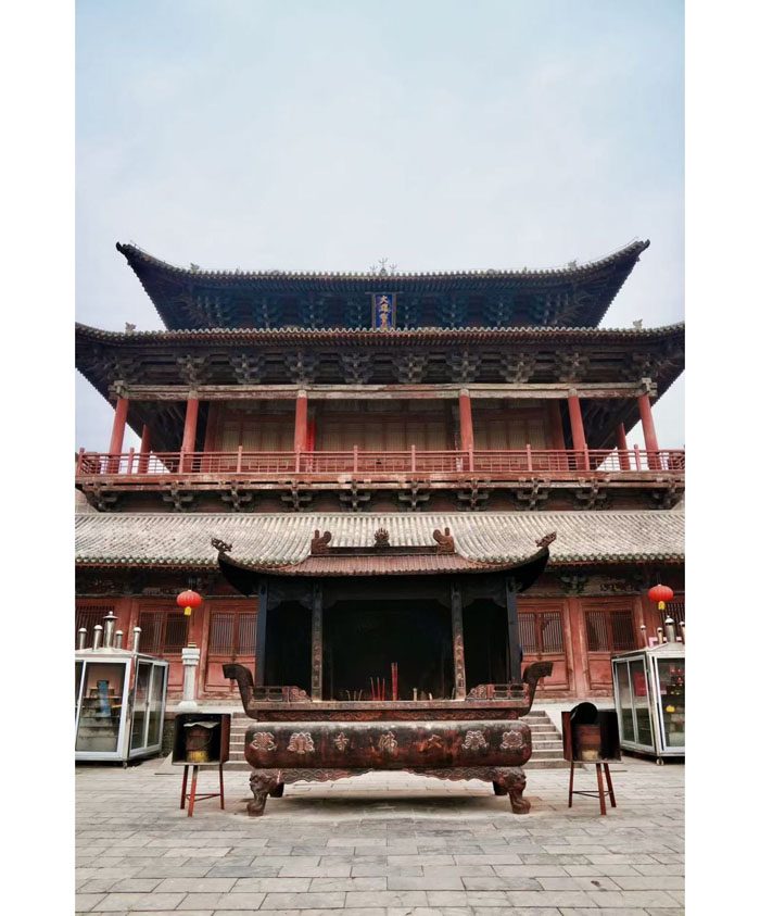 沿着台阶拾级而上,穿过天王殿便来到了大佛寺的核心──大雄宝殿。公开报道显示,这座大殿也是目前山西省面积最大的单体仿元建筑。