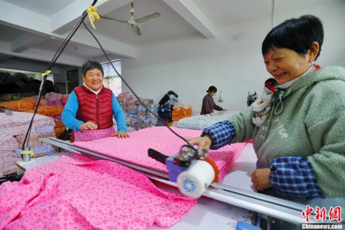 在一间民房改造的加工车间里,53岁的姚淑民正熟练地操作着缝纫机,给秋裤做最后的收腰工序。“最早的时候,我们用剪刀裁剪,再用脚踏缝纫机缝制,一天最多做20条。现如今,各家各户更新了自动化设备,5分钟就能做出一条秋裤,一天大概能做1300条到1400条。”