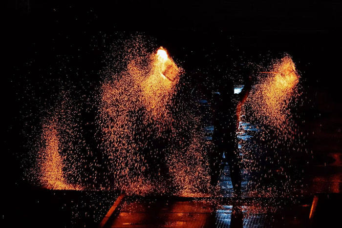 夜幕降临,华灯初上,一位位打铁匠人舞动着1600多℃的高温铁水,千朵万朵铁花瞬间在空中绽放,犹如繁星点点,呈现出“火树银花不夜天”的盛景。