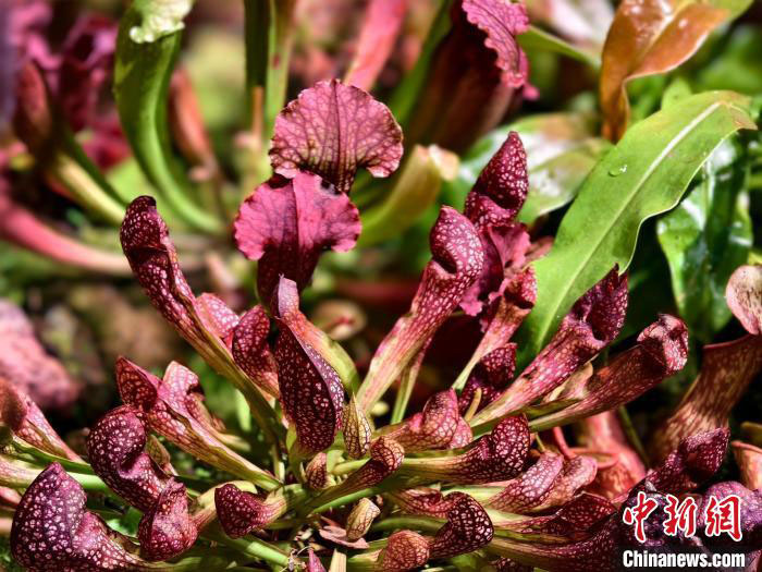 在云萝植物园兰亭A馆内,姿态优雅的女王鹿角蕨长达2米,其营养叶厚且高大,宛如一顶精致的女王冠冕,而孢子叶外形酷似鹿角。该馆还推出食虫植物展,共展出猪笼草、捕蝇草、花柱草等6属33种食虫植物。