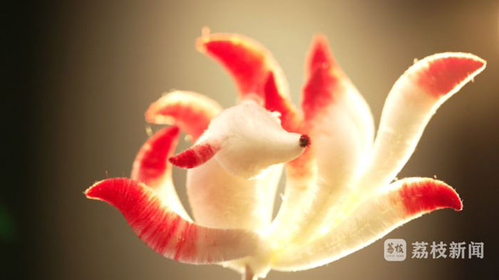 在严鑫看来,勾条是最能体现南京绒花特色的一个步骤。“因为这是一个从2D变换成3D的过程。尤其是颜色的渐变最为神奇。我还记得赵老师第一次给我们演示勾条这个步骤时,做了一只小鸟。他用蓝色和黄色两种颜色的蚕丝,像颜料一样融合,最终勾出了新的颜色绿色,我当时觉得非常新奇。”