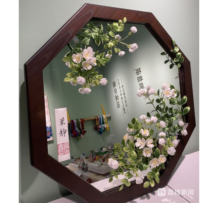 他还以自己第一次制作出的绒花作品茉莉花为灵感,创作了一个关于茉莉花的镜子摆件作品。“以往我们常用花瓶或者相框,我的这个作品选择了镜子,然后将茉莉花点缀在了周围,这样就把绒花融入进了我们的日常生活,也通过镜子衬托出绒花的美。”