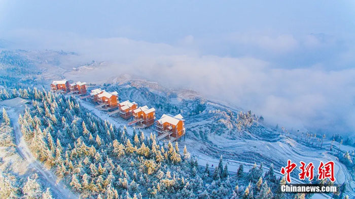 位于雪峰山北麓的山背花瑶梯田,在白雪的映衬下宁静而秀美,由七栋民宿组成的“星空云舍”点缀其中,犹如童话里的仙境之景。