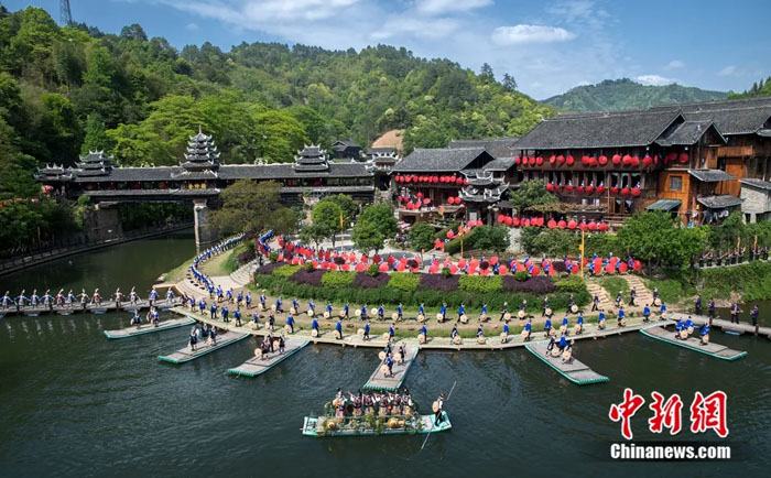 合拢宴,是侗族人招待客人的最高礼仪,几十米的长桌上摆满侗族特色菜肴,大家坐在一起,伴着侗族人的歌声,吃转转席、喝转转酒,体验歌不停酒不断的“高山流水”。