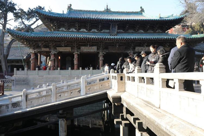 中国最早的水陆立交桥──鱼沼飞梁。鱼沼飞梁西依圣母殿,东邻献殿,初建在北魏之前。飞梁的形式古朴,横跨于鱼沼之上,借以观赏景物,南北东西四面伸长,如鸟之振翼欲飞状,是中国少有的一种十字桥梁形式,被誉为中国最早的水陆立交桥。