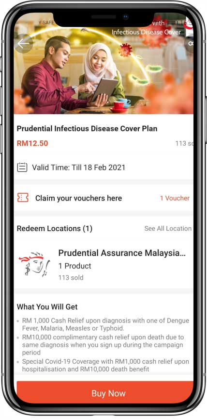 Shopee用户可在Shopee应用程式搜寻“保诚保险传染性疾病保单 (Prudential Infectious Disease Cover Plan)”,并依照步骤购买即可。如保单持有人被确诊患上任何上述说明的疾病,他/她将可得到一次性的RM1,000现金补助;因相同疾病 1 逝世则可进一步得到RM10,000的现金补助。此仅需RM12.50保费的保单的有效期限为1年,从申请日开始算起。